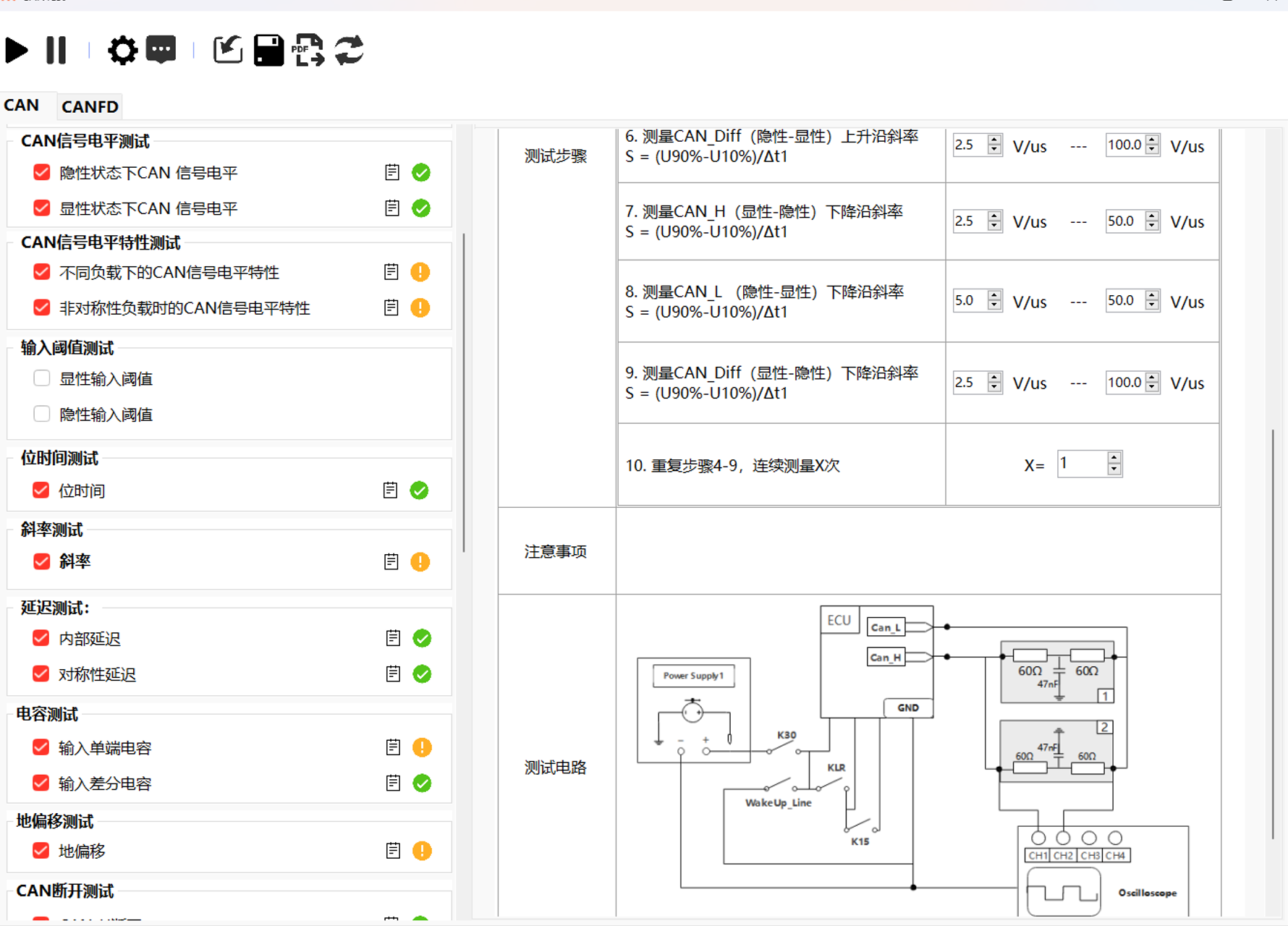 CANPT是基于夺智智能科技自研的核心板卡,配备必要的电压  源、示波器、万用表等核心外围设备,可自动化完成汽车零部件CAN  节点物理层测试的CANFD一致性测试设备。物理层测试的目的是验证 节点及测试系统在电路设计、物理电平特性等方面的性能,就是保证  节点能够正确连入总线的基础,其测试内容包括电阻电容特性、节点  差分电阻、故障容错测试、CAN线上的物理电平特性等等。