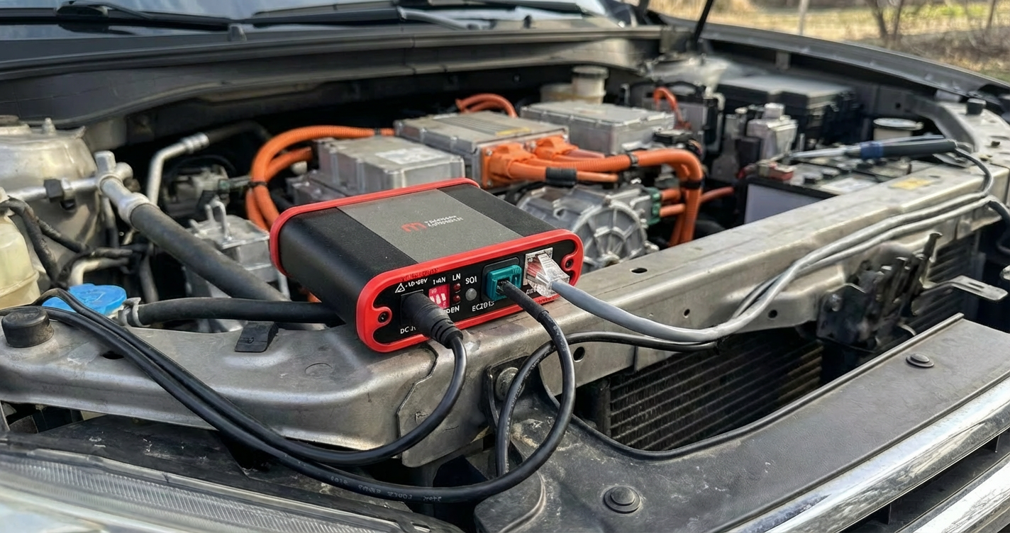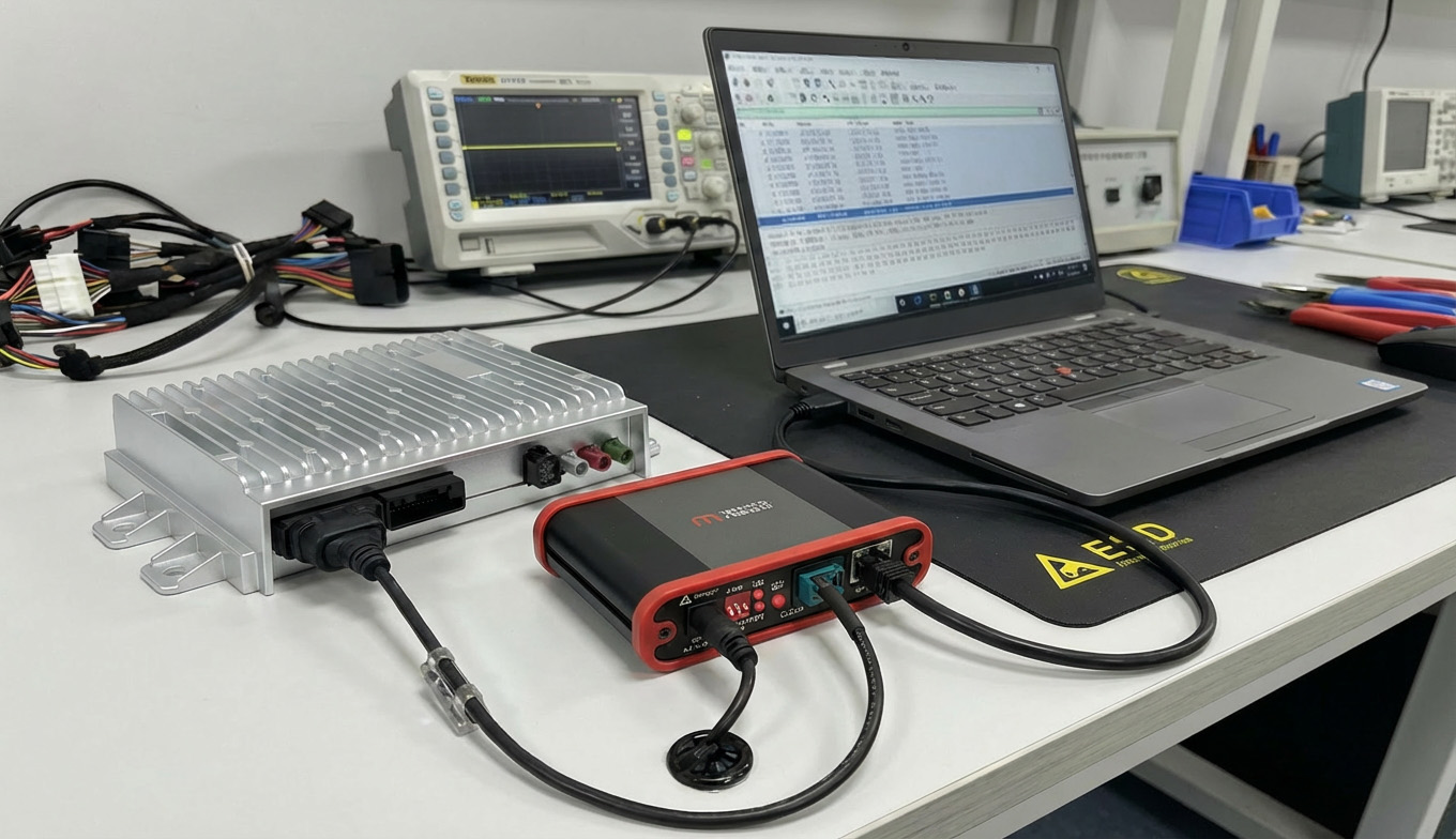 以太网转换器2.5G/5G/10G EC4001 EC4001以太网转换器能够将2.5G/5G/10G base-T1的车载以太网转换为光口的以太网。数据可以全双工双向传输。能够满足传统电脑与基于2.5G/5G/10G base-T1的车辆控制器进行通讯。 获取报价 产品特点 Rosenberger E6S201-40MT5-Y车载以太网接口 4.5~36V宽工作电压,最高承受-30~40V电压,满足12/24V系统 满足12/24V车辆ISO 16750-2, ISO 7637-2测试标准(除Pulse 5A),可以实车使用 支持USB、香蕉头、DC5.0多种供电接口 Link灯实时显示连接状态,彩虹灯显示通讯质量 拨码开关简单配置,实时配置无需重启 数据零修改,无损传透 标准用例 使用场景 实验室环境控制器通信调试 该场景展示了实验室车辆控制器与上位机电脑的典型连接方式,中间的EC系列设备作为通信接口节点,通过线缆在控制器与电脑之间建立稳定的数据交互链路。工程师可在电脑端对控制器进行监测、调试与功能验证,确保通信流程的可靠性与一致性。 实车环境调试 该场景展示了实车环境调试应用,EC 系列通信接口设备通过汽车以太网端口接入车辆电子控制器,实现与外部测试系统的高速通信。设备在实际车辆上使用,完成车辆对以太网的数据接入与收发,支持工程师在实车条件下进行网络调试、数据采集与系统验证。该配置适用于研发路试、车辆控制策略验证及车载网络的实时诊断等工程应用场景。 工业生产环境场景 EC 系列车载以太网转换器在工业生产环境的控制机柜中,用作电子控制器测试的通信桥接节点。设备在汽车以太网与标准以太网之间提供稳定可靠的数据转换。该配置广泛应用于控制器下线检测流程。 资料下载 产品手册