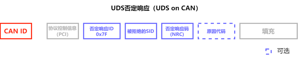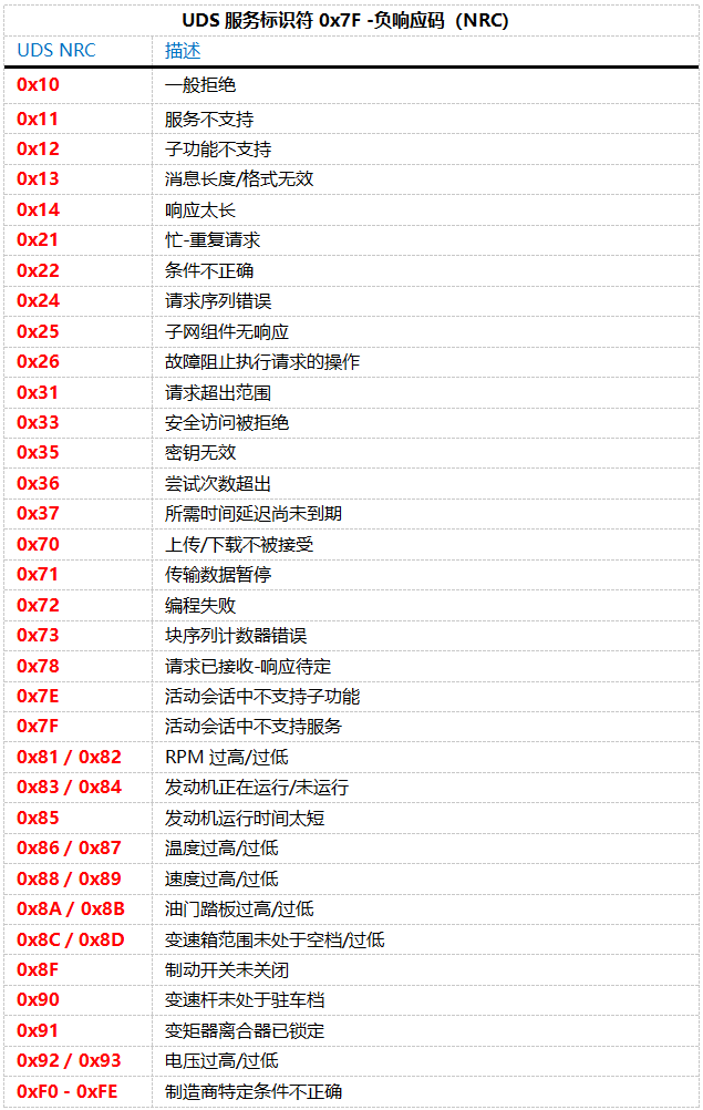 - 第四个字节,否定响应码(NRC):这个码提供了请求失败的具体原因,比如“不支持该服务”或“请求格式错误”等。