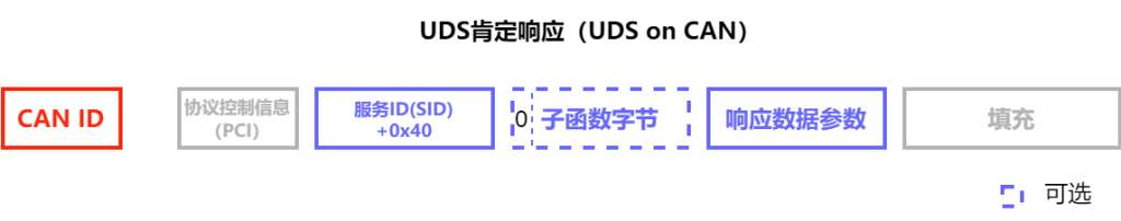 - 第一个字节,协议控制信息(PCI):这部分和UDS的具体操作无关,但它是UDSonCAN响应消息的必要组成。