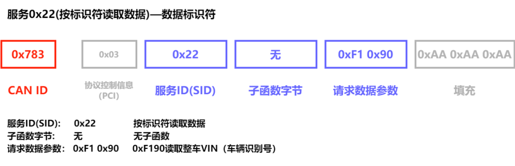 请求帧示例:03 22 F1 90 AA AA AA AA