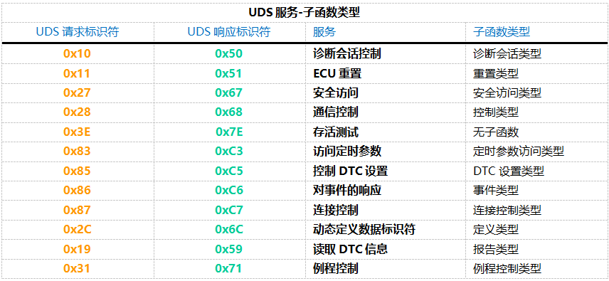 当我们使用UDS去执行不同的服务时,我们需要在传输的报文里使用特定的UDS服务标识符(SID)。这些标识符主要有两种:请求标识符和响应标识符。通常,响应标识符就是请求标识符的数值上加上0x40。如果你看下面的图表,你会发现UDS(ISO 14229)标准支持的所有请求和响应标识符都列在那里了。