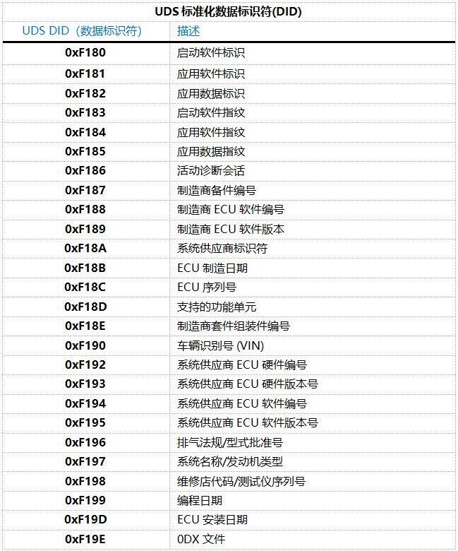 上例中0x22服务中使用一个数据标识符(DID),长度2字节值来获取ECU里面对应DID的数据结果。部分DID对应的数据含义已经在标准中定义了。