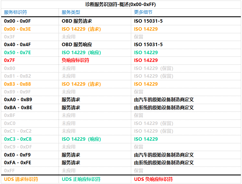 确实,UDS服务标识符(SID)中只有一部分数字是被标准化使用的。还有一些服务标识符被其他标准所使用。例如,从0x00到0x0F的标识符是专门为OBD服务保留的。这种区分有助于避免不同系统间的标识符冲突,确保每种服务的唯一性和可识别性。